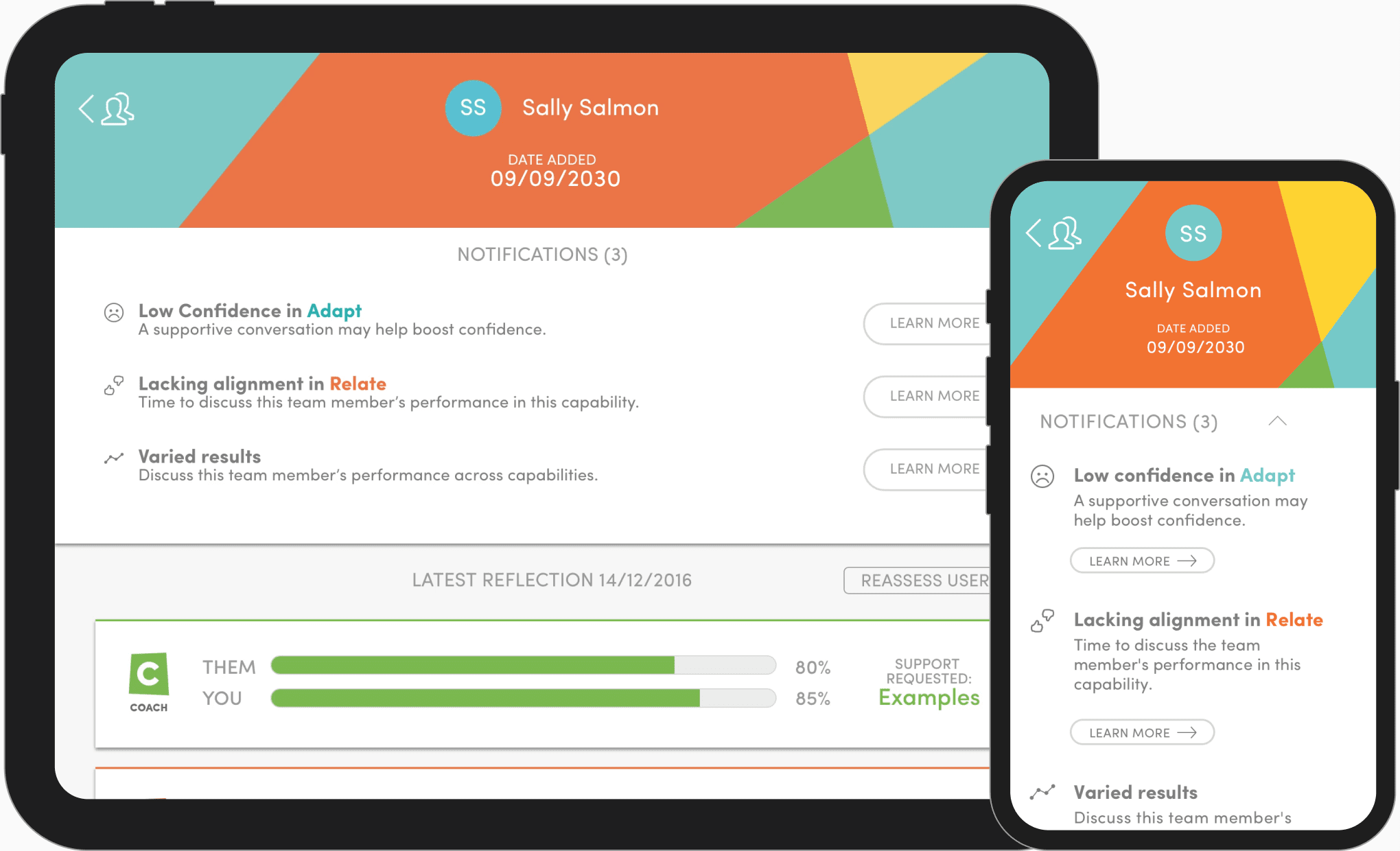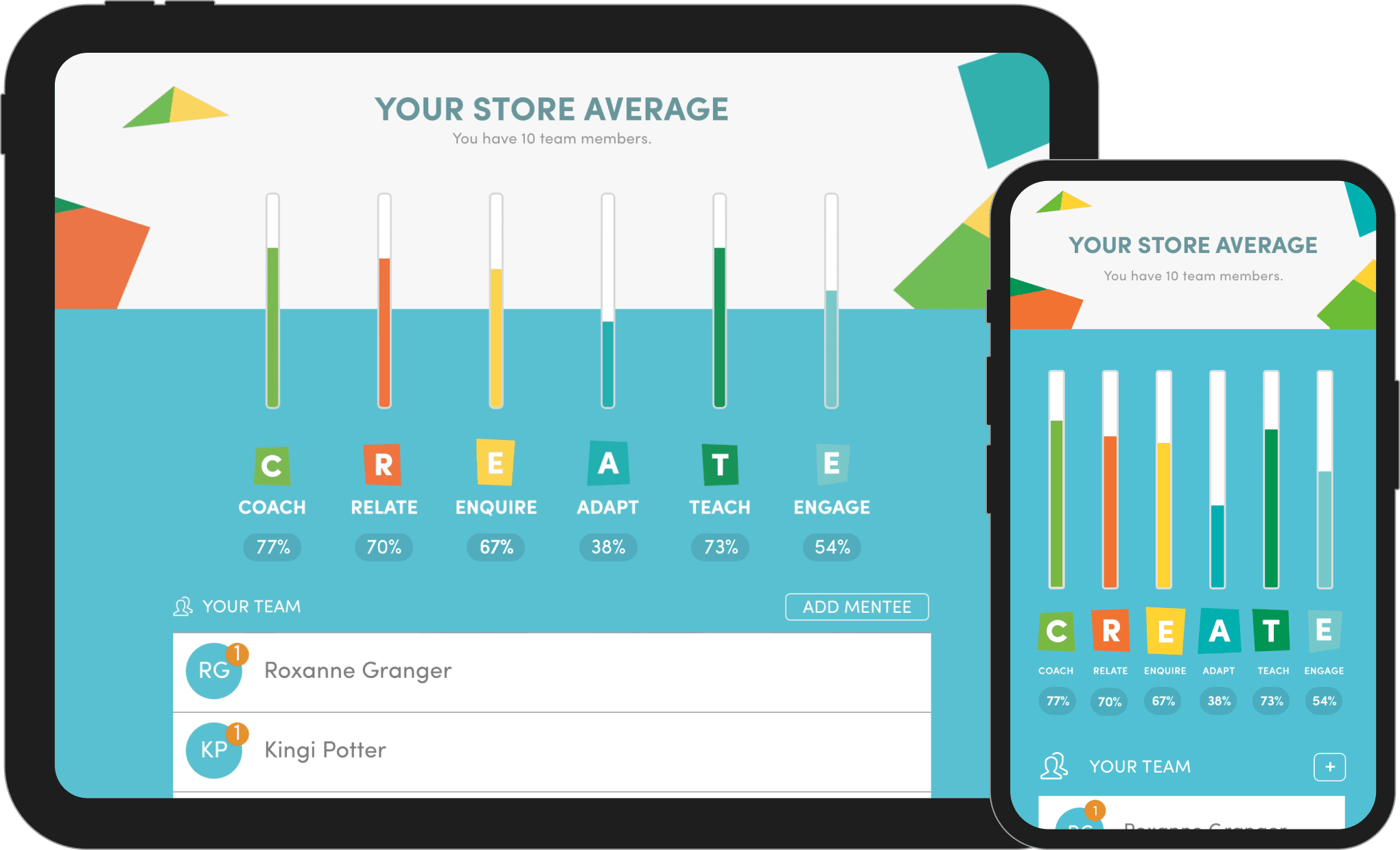 Mentor mode allowed a store mentor to add their assigned store team members, review their self-assessments and additionally perform their own assessments on team members to visualise alignment between the two in a summary dashboard.