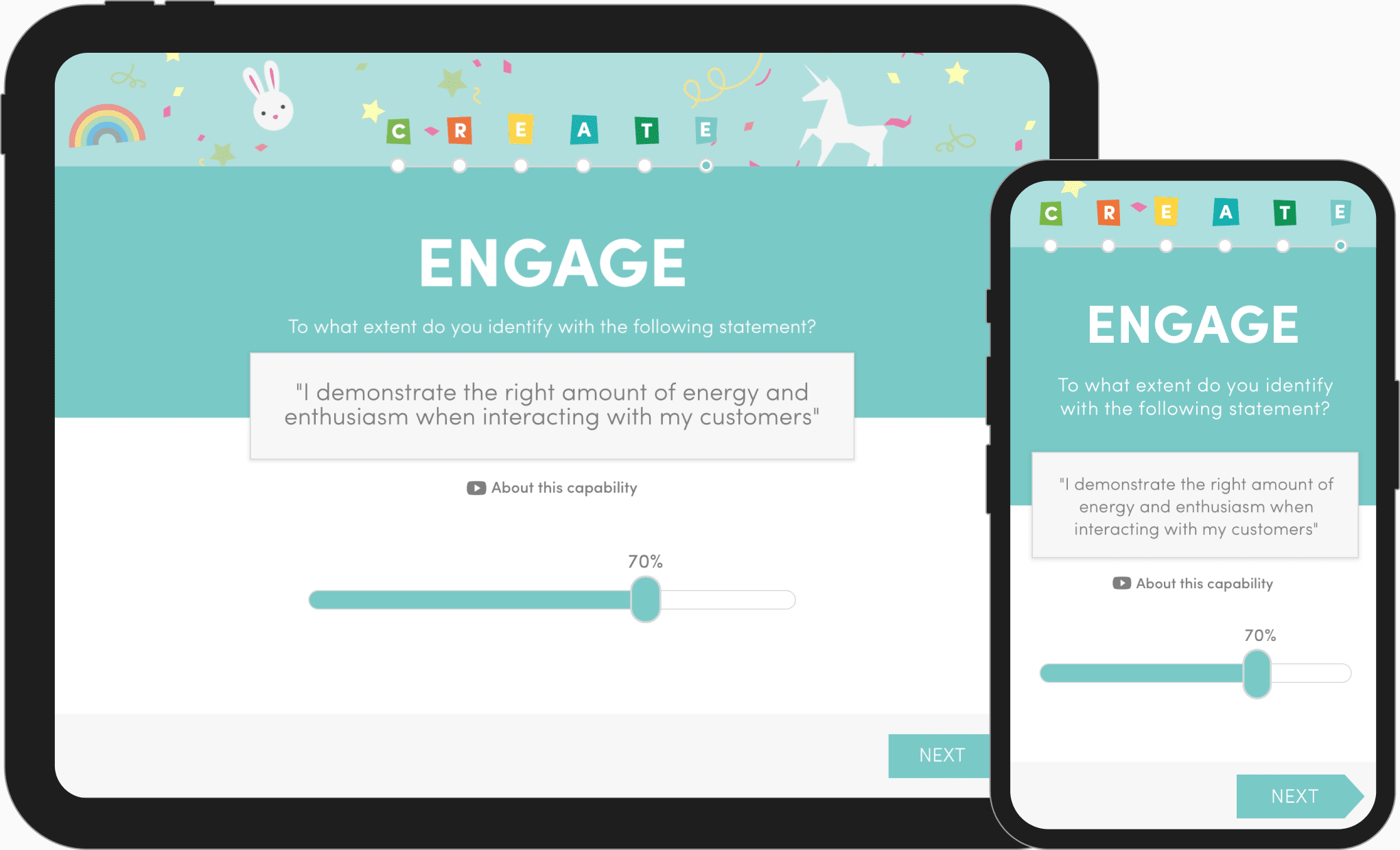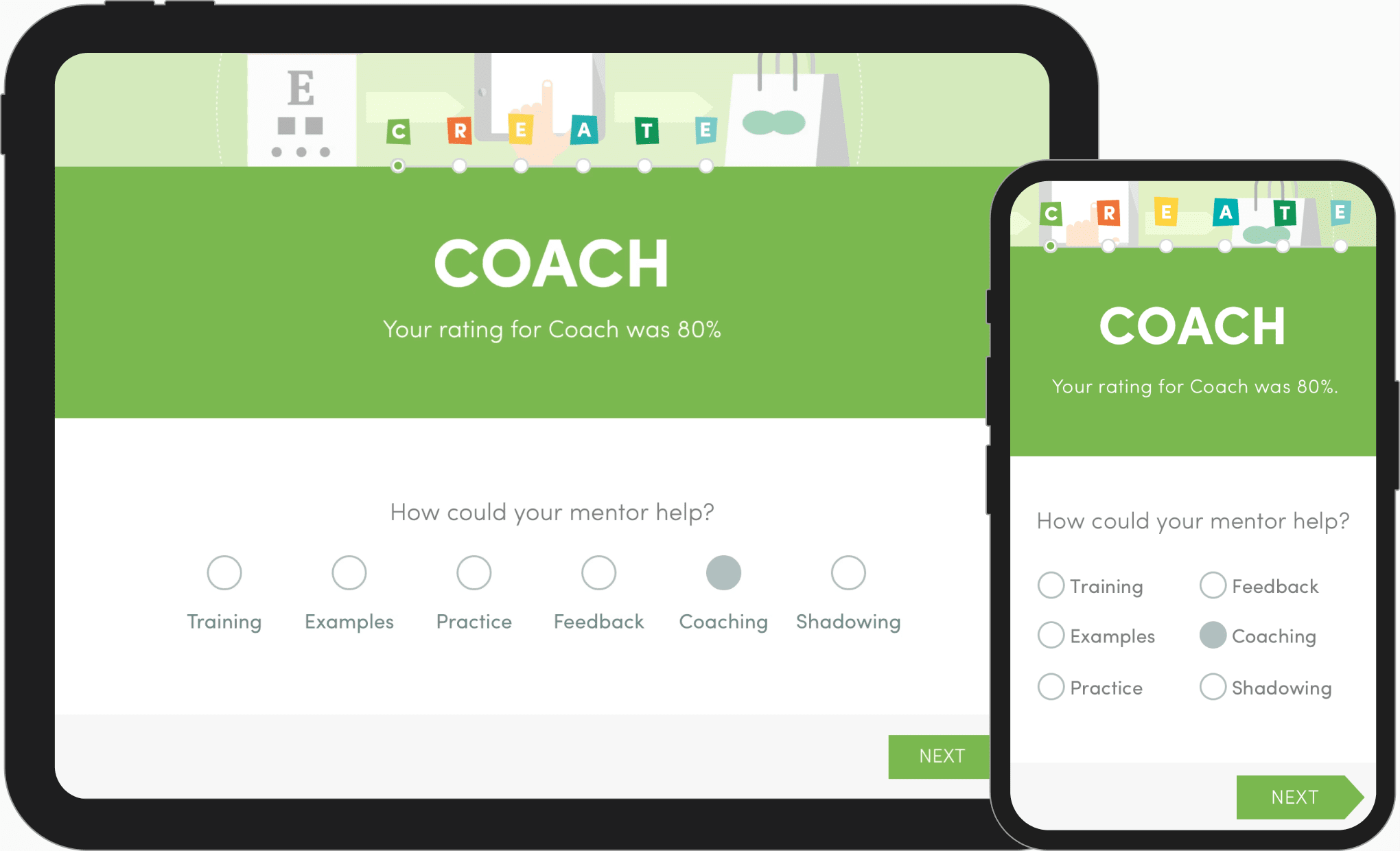Team member mode enabled a user to complete a self-assessment of their performance in the CREATE capabilities, and to specify which type of learning support they required from their store mentor to assist them in each area. A unique user code was generated that the team member could supply to their mentor.
