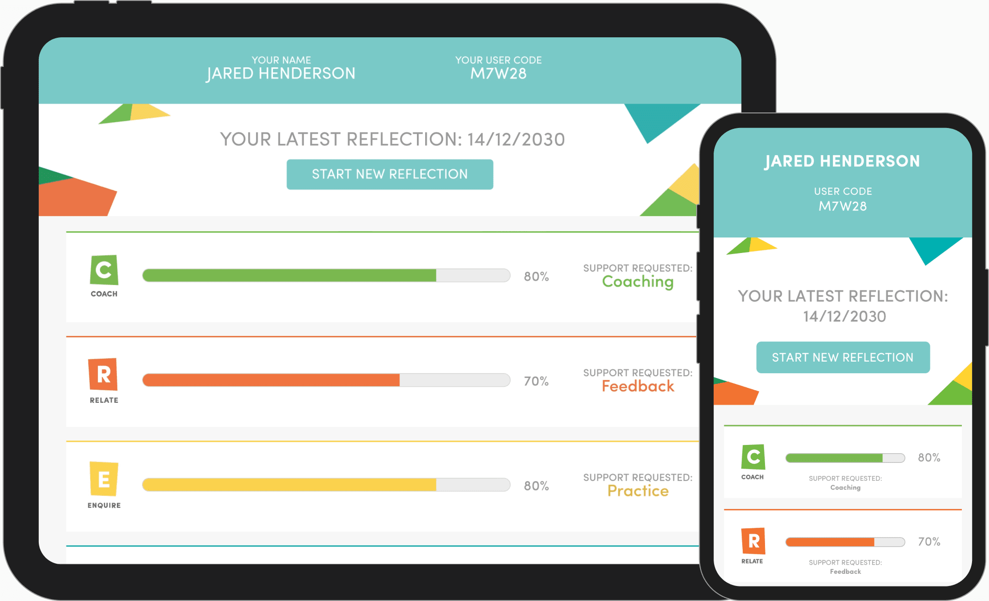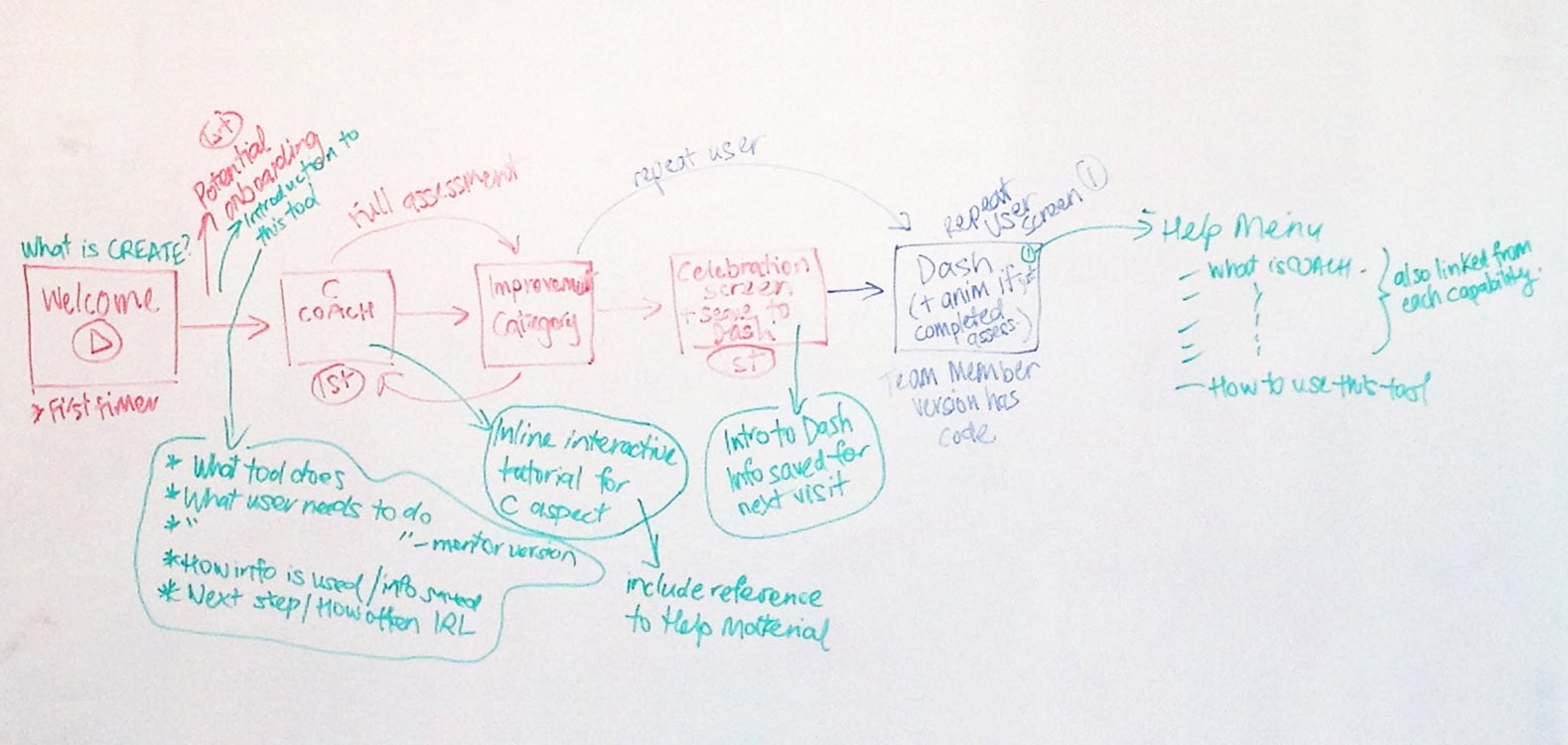 It features 2 modes: Team member and Mentor. Support material was available contextually for both modes throughout the app, including videos, scenarios and comprehensive coaching documentation.