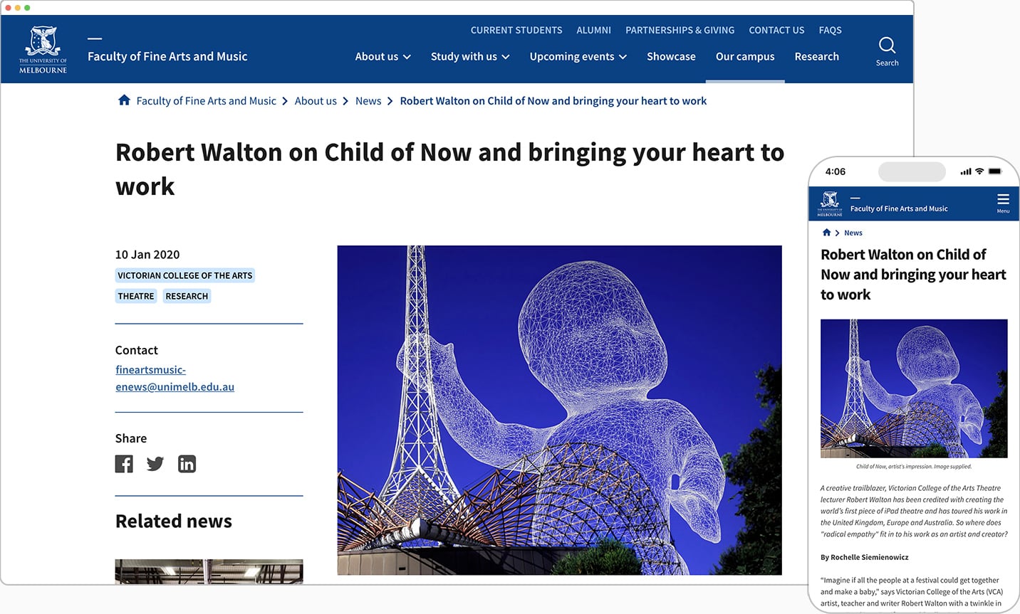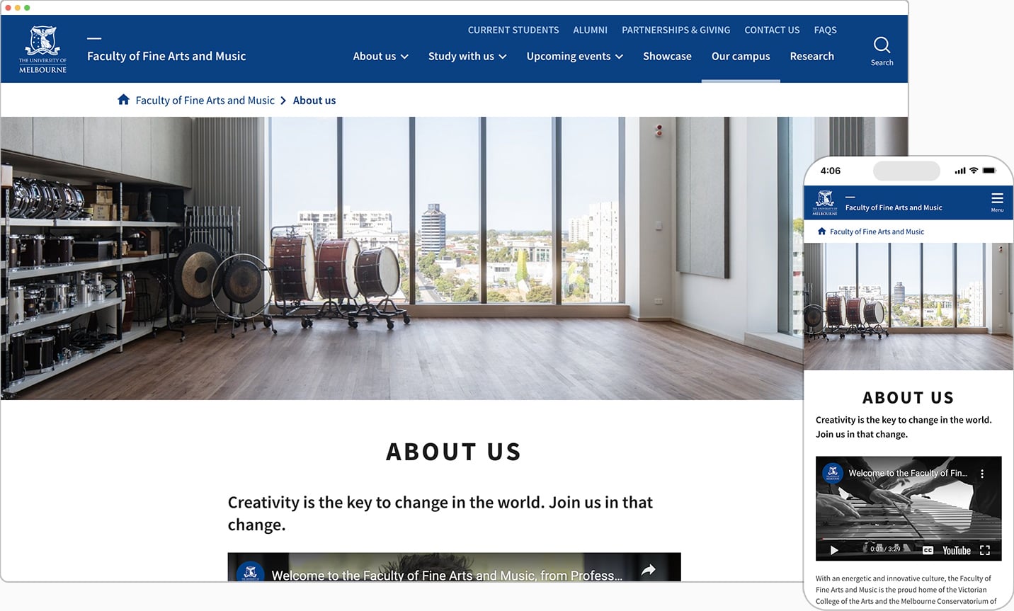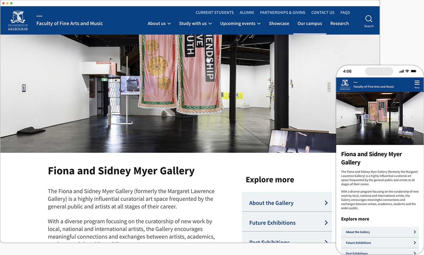 In 2019, the Faculty of Fine Arts and Music initiated a website consolidation and re-design project to bring their various school, centre, gallery and publication websites under a single domain and information architecture using the University's design system.
